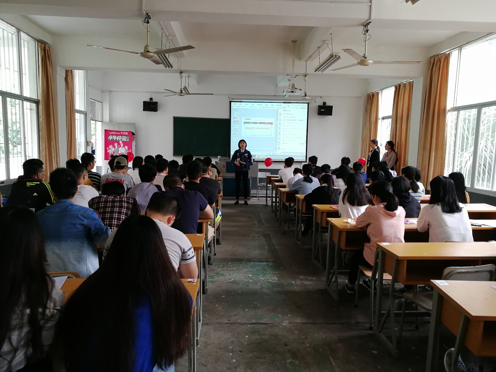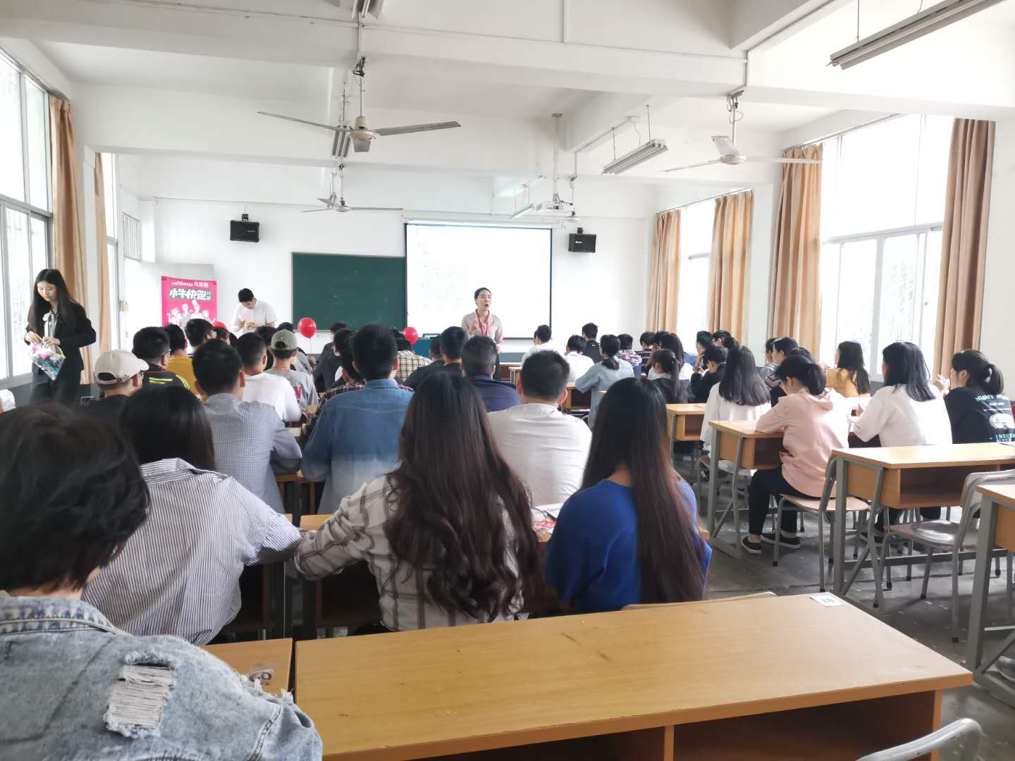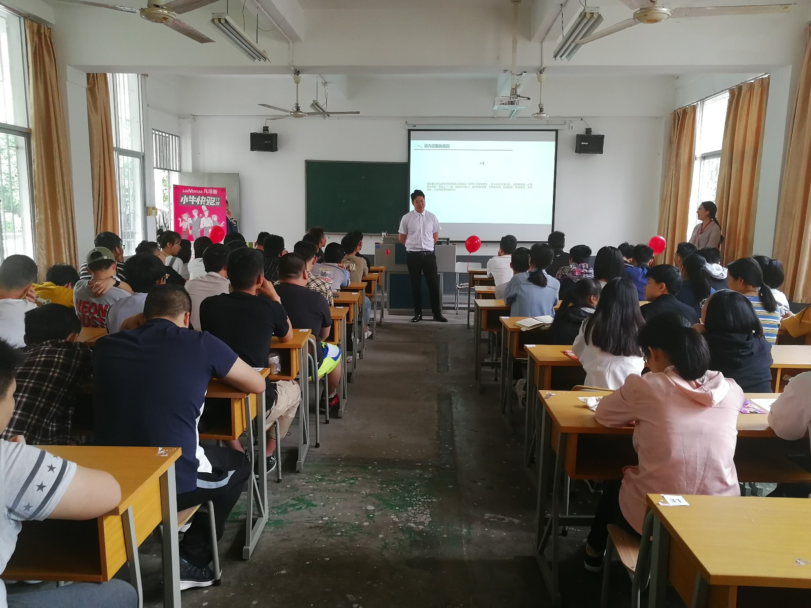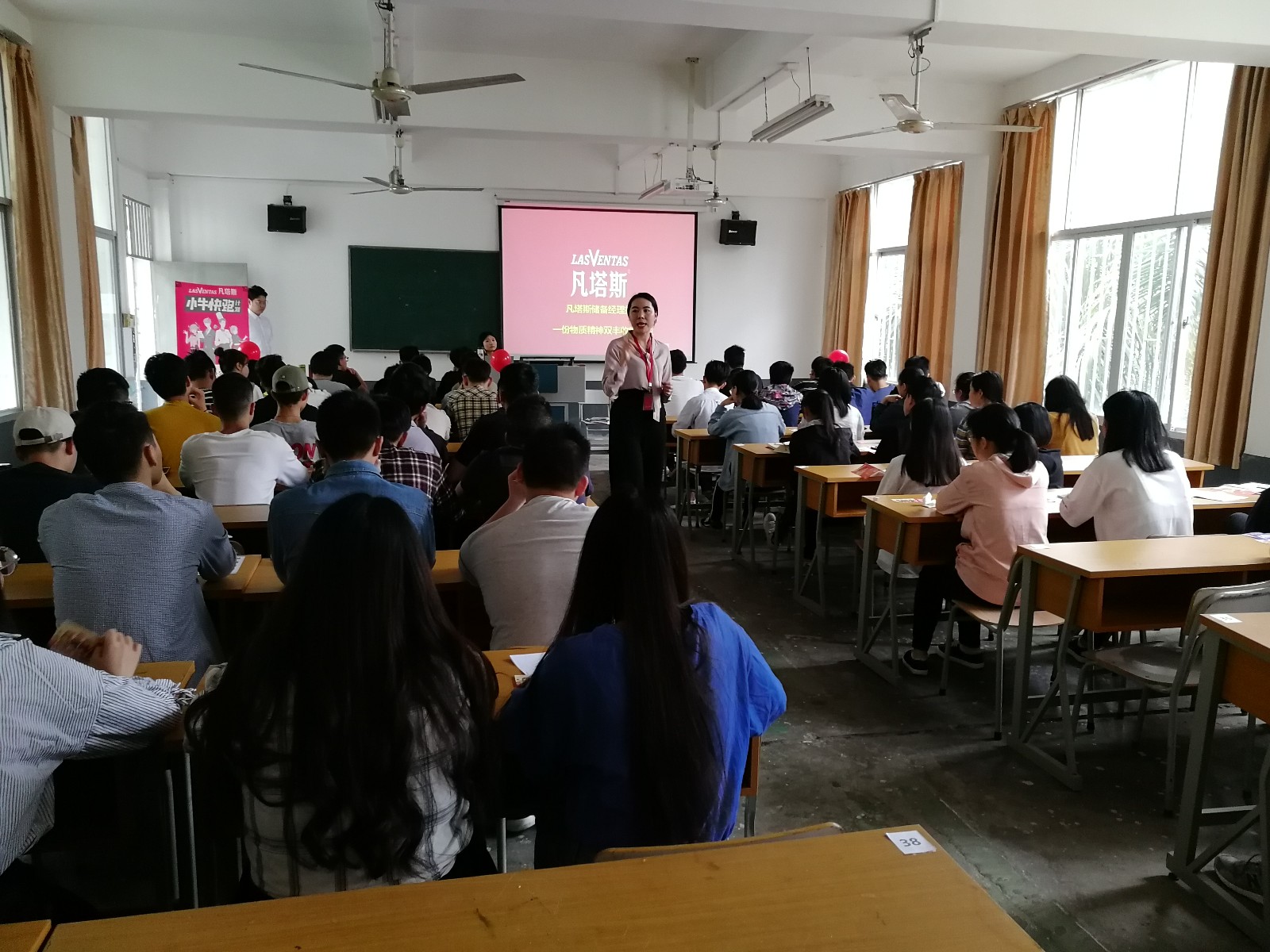本次宣讲会在207多媒体教室进行,何经理通过一段视频介绍了凡塔斯公司的企业概况及企业文化等内容;随后,何经理带领现场所有同学做了一份性格测试,测试结束之后,何经理给同学们分析了测评结果,接着,根据测评结果,何经理给出了相应的岗位需求以及发展路径规划等供同学们了解。最后,分别来自15级、16级的卢祺和蒋培培同学给在场的同学分享他们在凡塔斯的工作和实习经历,同时回答了学弟学妹们的提问。