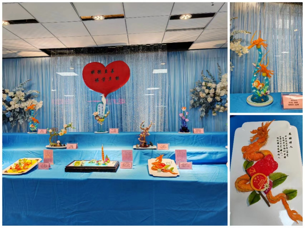 本次学生职业技能大赛分为中西式面点制作、果酱画制作、食品雕刻、烹饪基本功、创意糖艺制作、冷拼制作等6个赛项。参赛学生赛前都在紧锣密鼓的训练,精心设计作品,力求作品尽善尽美。活动现场人头攒动,赞叹声此起彼伏。尤其是糖艺作品“忽如一夜春风来,千树万树开”,惟妙惟肖,意境十足。冷拼作品“龙的传人”在构图和内涵的处理上也非常出彩。