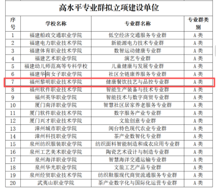 近日,福建省教育厅公示了福建省第二期高水平高职学校和专业建设计划拟立项建设单位名单,根据《关于福建省第二期高水平高职学校和专业建设计划立项建设学校名单的公示》文件,我系“健康餐饮技艺与品控专业群”获批省级高水平专业群。