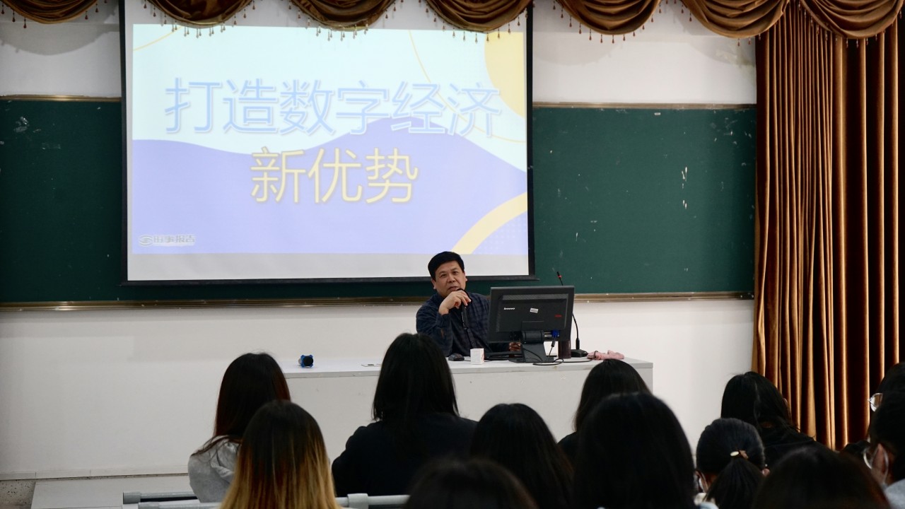 4月19日下午,范超峰院长再次走进课堂,为学生讲授了一堂题为“打造数字经济新优势”的形势与政策专题报告。他引用习近平总书记关于科技强国的重要论述,强调推动互联网、大数据等核心技术发展,有利于推动构建新发展格局、建设现代化经济体系和构筑国家竞争新优势。思政教研室全体教师与21级广告艺术设计专业学生共同聆听了报告。