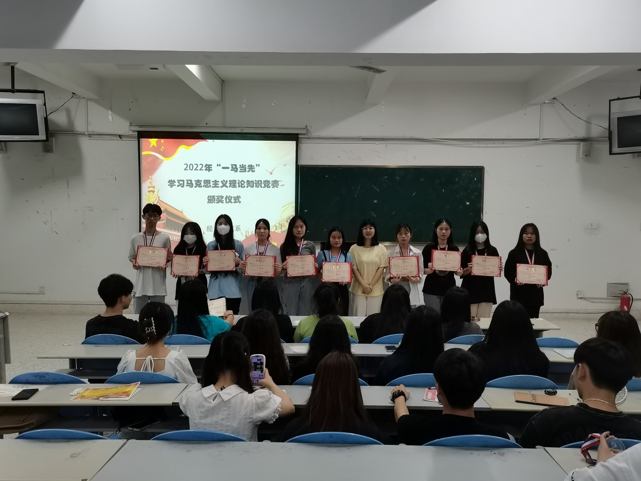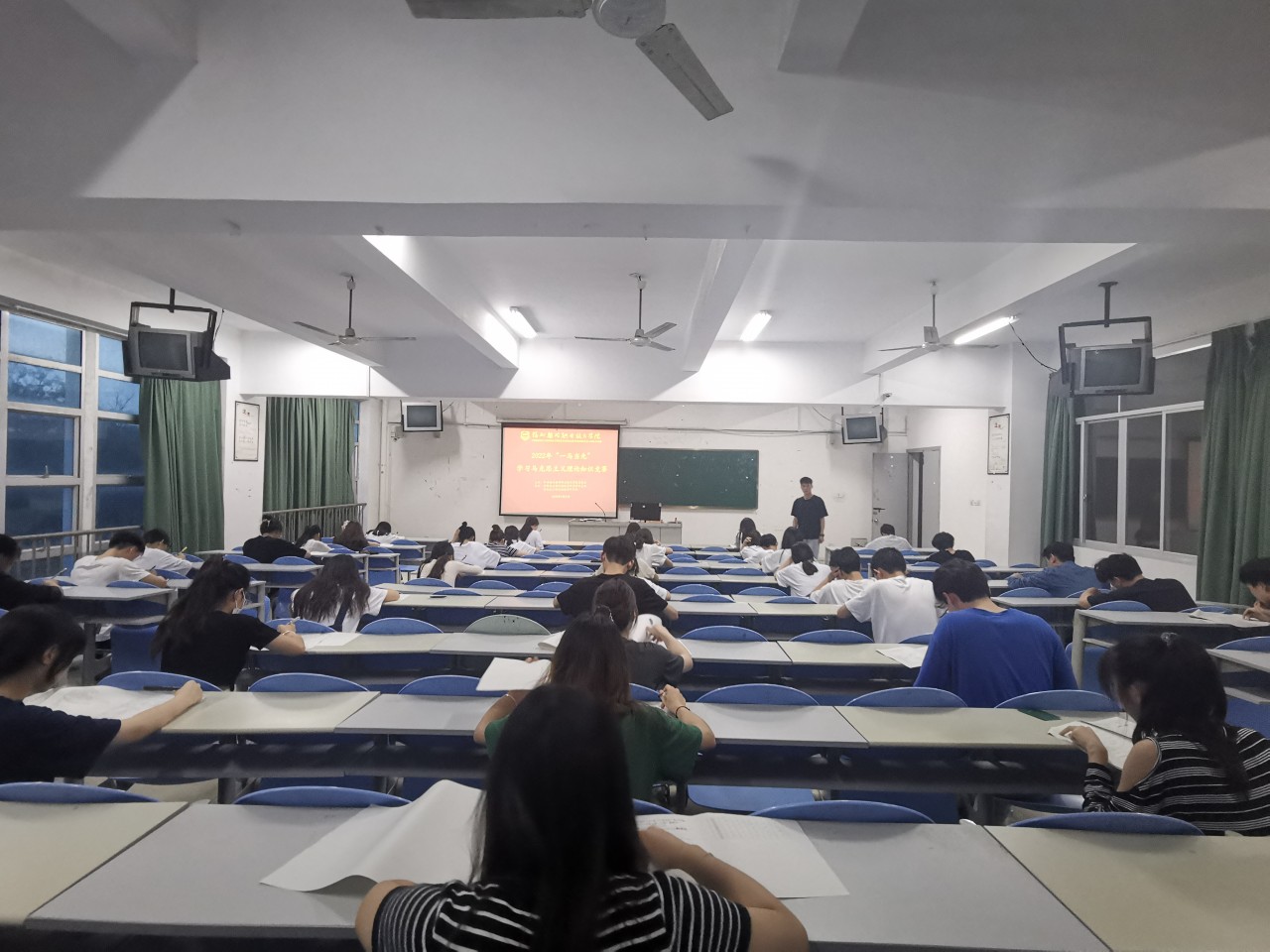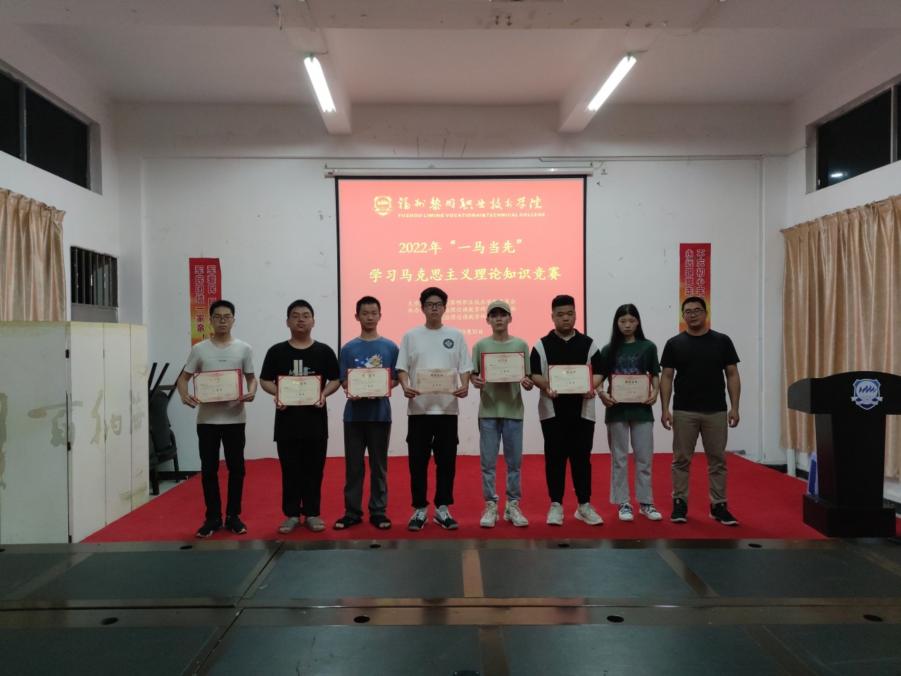 为教育引导广大学生学党史、知党情、感党恩、听党话、跟党走,深入开展习近平新时代中国特色社会主义理论学习,增强广大青年学生的理论认同,以优异成绩迎接党的二十大胜利召开,由中共福州黎明职业技术学院委员会主办,思想政治理论课教学研究部党支部、思想政治理论课教学研究部承办的2022年“一马当先”学习马克思主义理论知识竞赛,于5月31日晚在福屿校区、地球村校区同时进行了决赛,来自6个系的120余名同学参与比拼。