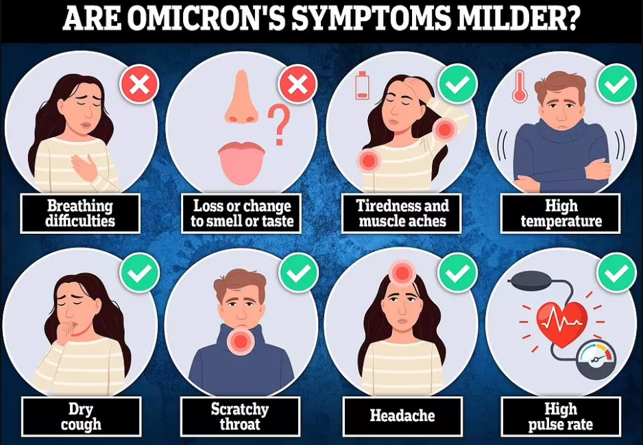 库切说,她接触的Omicron患者症状包括疲倦、肌肉酸痛、头痛和干咳等,但没有人报告嗅觉或味觉丧失或呼吸困难等新冠肺炎的明显症状。