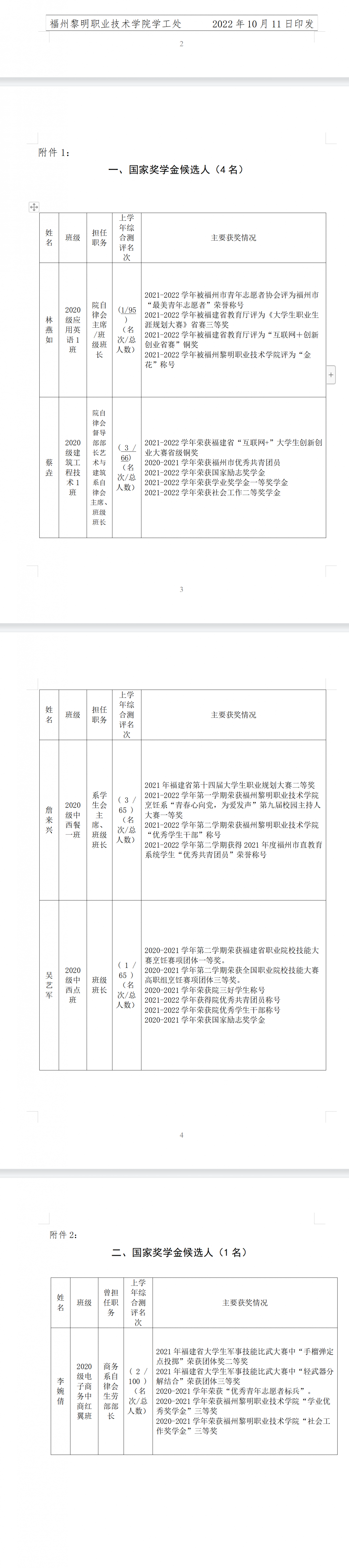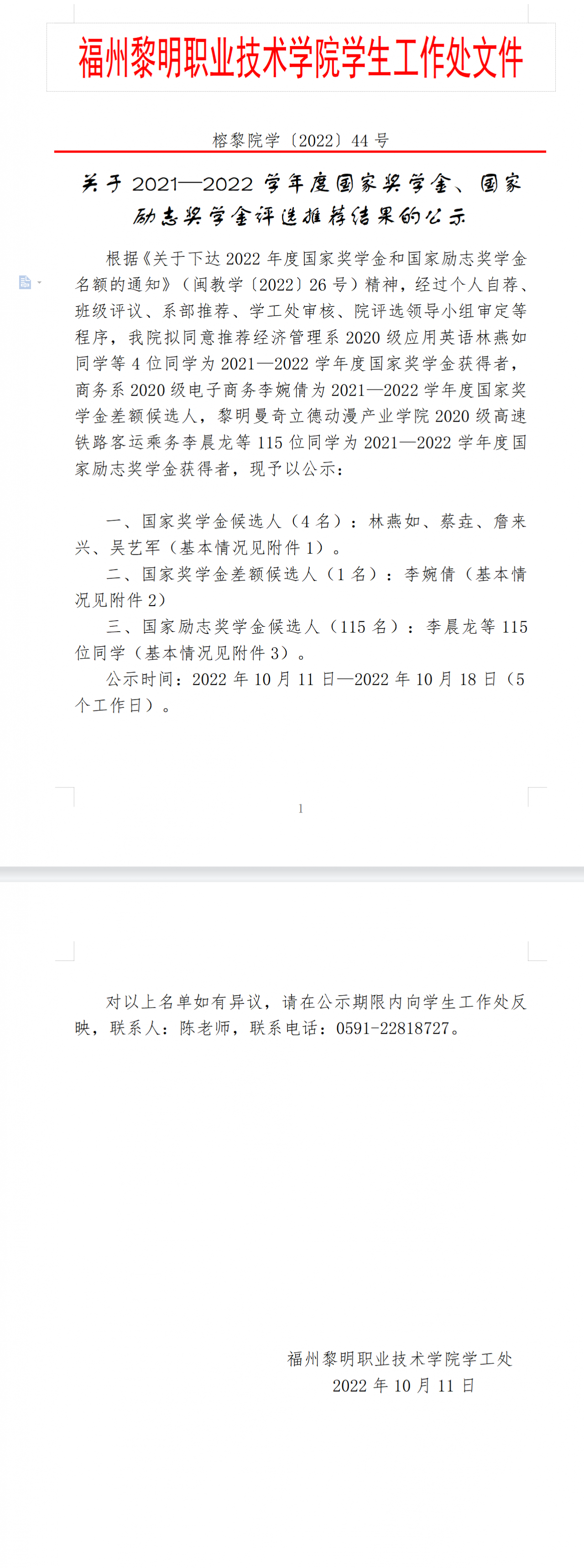 榕黎院学〔2022〕44号 关于2021—2022学年度国家奖学金、国家励志奖学金评选推荐结果的公示