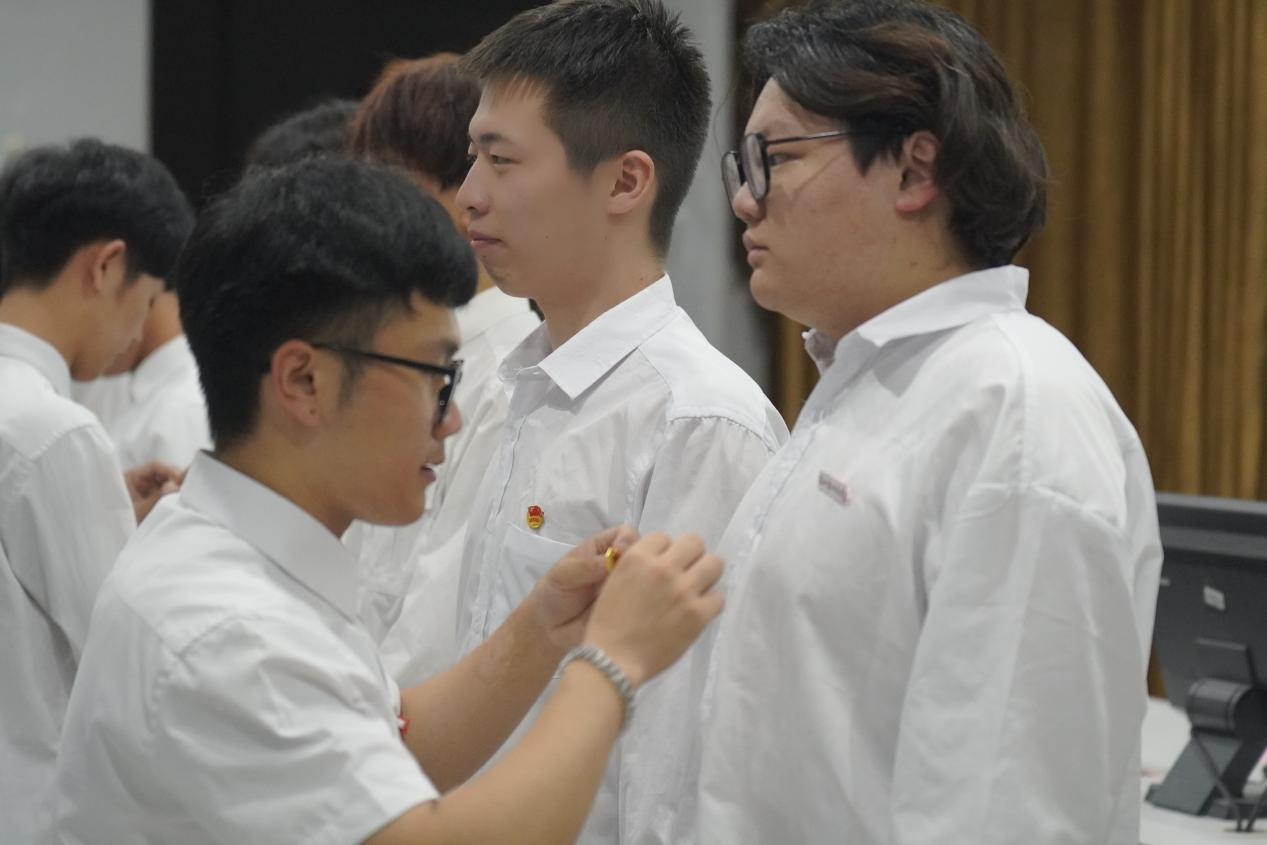 老团员郑重地给新团员颁发团徽,并为他们将其佩戴在左胸前。这代表着他们已经正式承担起作为一名共青团员的使命和责任。