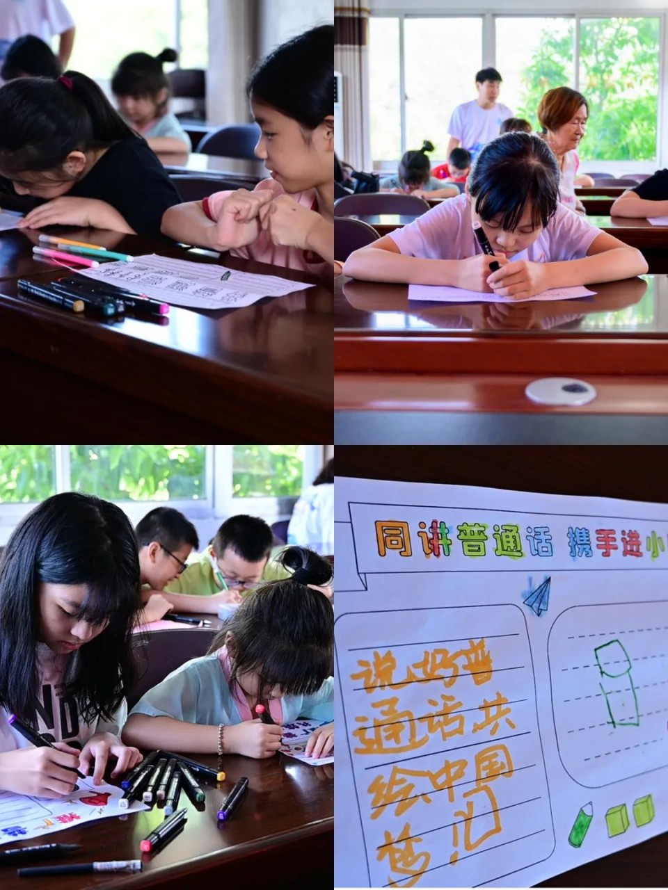 7月18日,“蒲公英”志愿队成员走进双龙村的游戏天地,为当地的儿童们开展“一字一句普通话,千言万语绘中华”的推广普通话手抄报活动,以加深乡村学生对普通话重要性的认识。