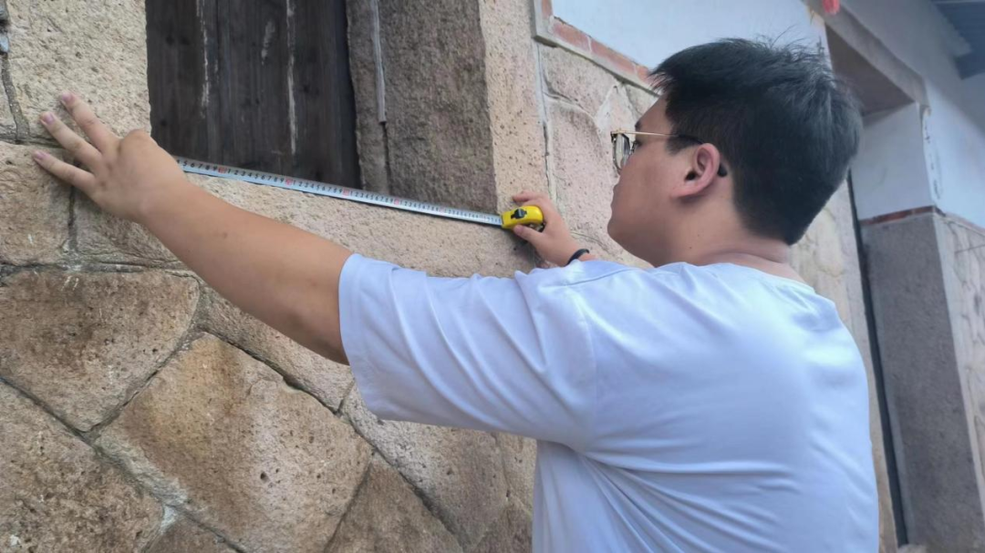 通过对食菜厝的探访参观与高书记的讲解,实践团队了解到,食菜厝不同于传统古厝,结构特殊,因此在修缮和保护方面要格外上心。随后实践团队成员开展了古厝测绘建档、加固修复以及智慧监测工作。充分了解大山村的人文、地理、经济、环境等方面的情况后,实践队开始进行测绘建档和病害检测,对村庄中古建筑、自建房等古建筑物的主体结构,如地基基础、承重墙、柱等,进行评估和分类;后期也将制定方案,利用专业知识技术、仪器设备对目标建筑加固修复。