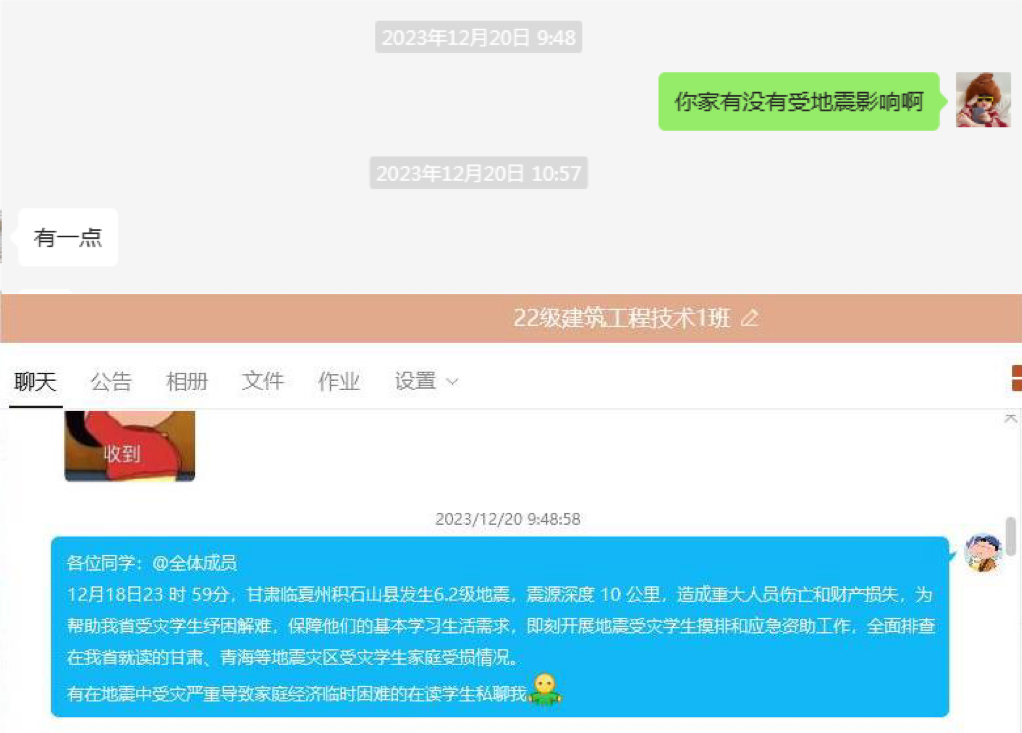 学校始终关心、牵挂着每一位同学,密切关注甘肃、青海、新疆等地受灾学生需求。学院资助管理中心第一时间发出通知,要求各系部及时对家庭受灾、造成困难的学生进行摸排,确保实时掌握学生情况,帮助有需要的同学渡过难关。