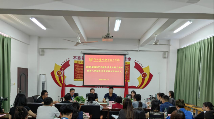 为深入学习贯彻党的二十届三中全会精神,落实立德树人根本任务,切实加强辅导员队伍建设,全面提升辅导员队伍的思想政治素质和职业能力水平,9月7日上午,我院2024—2025学年辅导员专业能力提升暨新入职辅导员岗前培训班开班仪式在五楼会议室举行,党委书记廖诗忠作开班讲话和首场报告,党委副书记刘鹏作开班致辞,各党总支(支部)书记、全体学工处干部、辅导员参加活动。开班仪式由学工处处长陈伟伟主持。