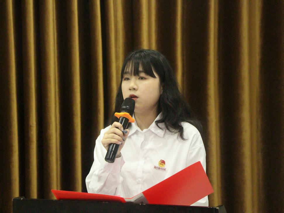 青年学生干部代表黄以琳同学向大家分享心得:她认为我们青年团员在新形势下,应明确共青团员绝不仅仅是一种所谓的政治标签,更是一种职责,一种动力源泉,我们应当保持与时俱进的精神状态,弘扬与时俱进的学习风气,开拓与时俱进的局面,学党史知党情跟党走。