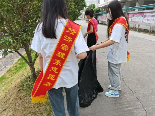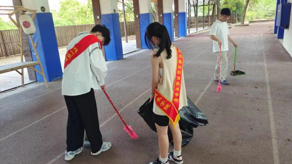 同学们手持垃圾袋、垃圾夹等清洁工具,不怕脏、不怕累,冲锋在前,辛勤劳动,用实践诠释劳动最光荣、劳动最美丽。