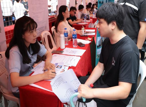 招聘会现场人头攒动,企业展位前的毕业生络绎不绝,用人单位积极向前来求职的学生介绍单位情况、岗位需求,耐心解答薪资待遇、职业发展前景等学生关心的问题。