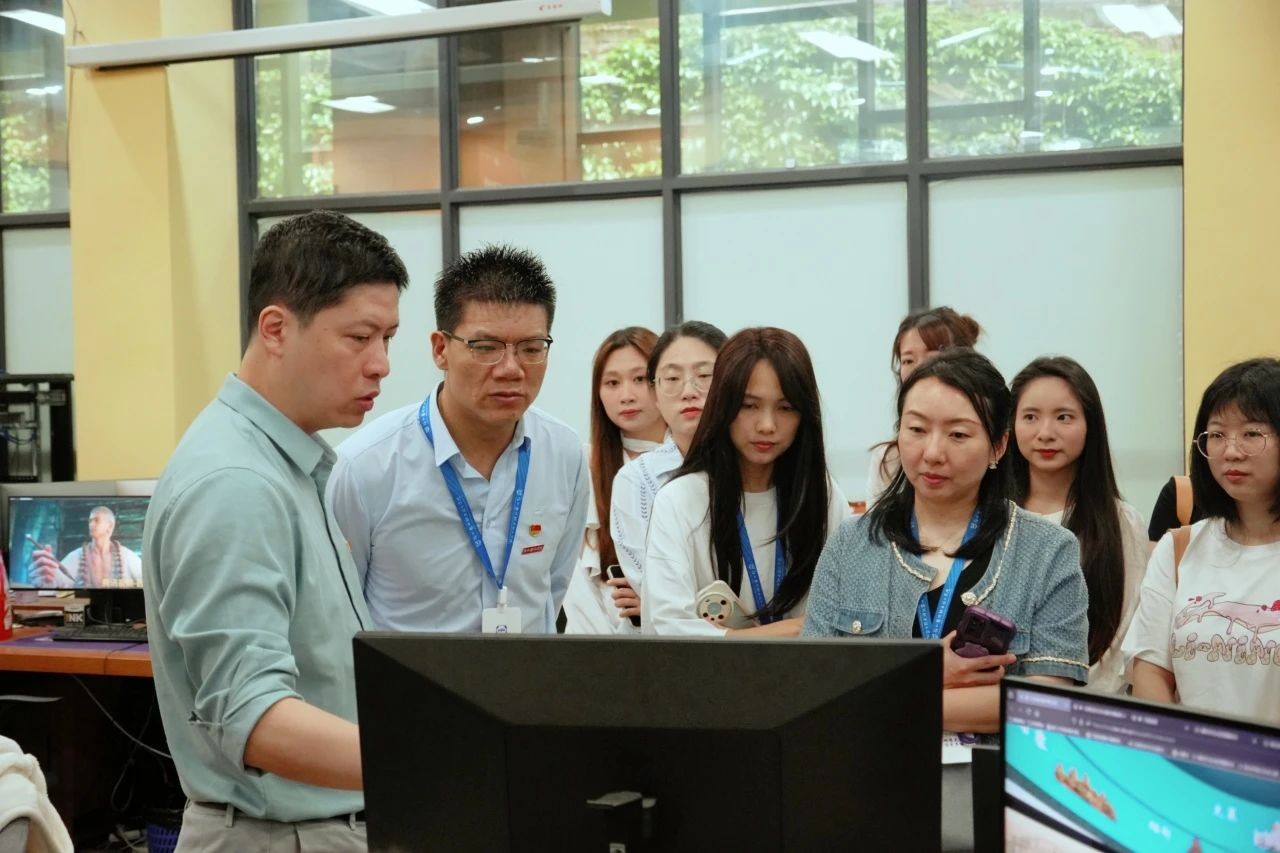 在池灵达院长的带领下,刘鹏副书记一行实地参观了阳光学院新媒体实训中心、虚拟现实技术工作室、全媒体直播间等教学场所,现场体验VR虚拟场景交互设备等特色设施,深入了解阳光学院在专业建设、实训实践和融媒体建设的创新举措与突出成效。