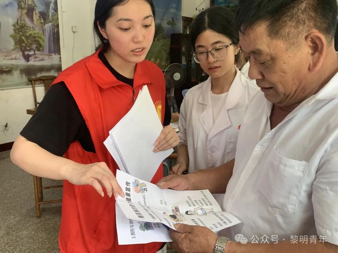 小陶镇五一村的活动同样反响热烈。在当地镇政府和村委会的协助配合下,义诊信息有效传达,现场早早聚集了三十余位村民排队等候。师生们热情服务,一边娴熟操作设备,一边与村民们话家常、了解生活习惯。血糖、血压检测一丝不苟,用专业知识为长者们的健康保驾护航,让关怀在乡村传递,红色精神在服务中闪耀。