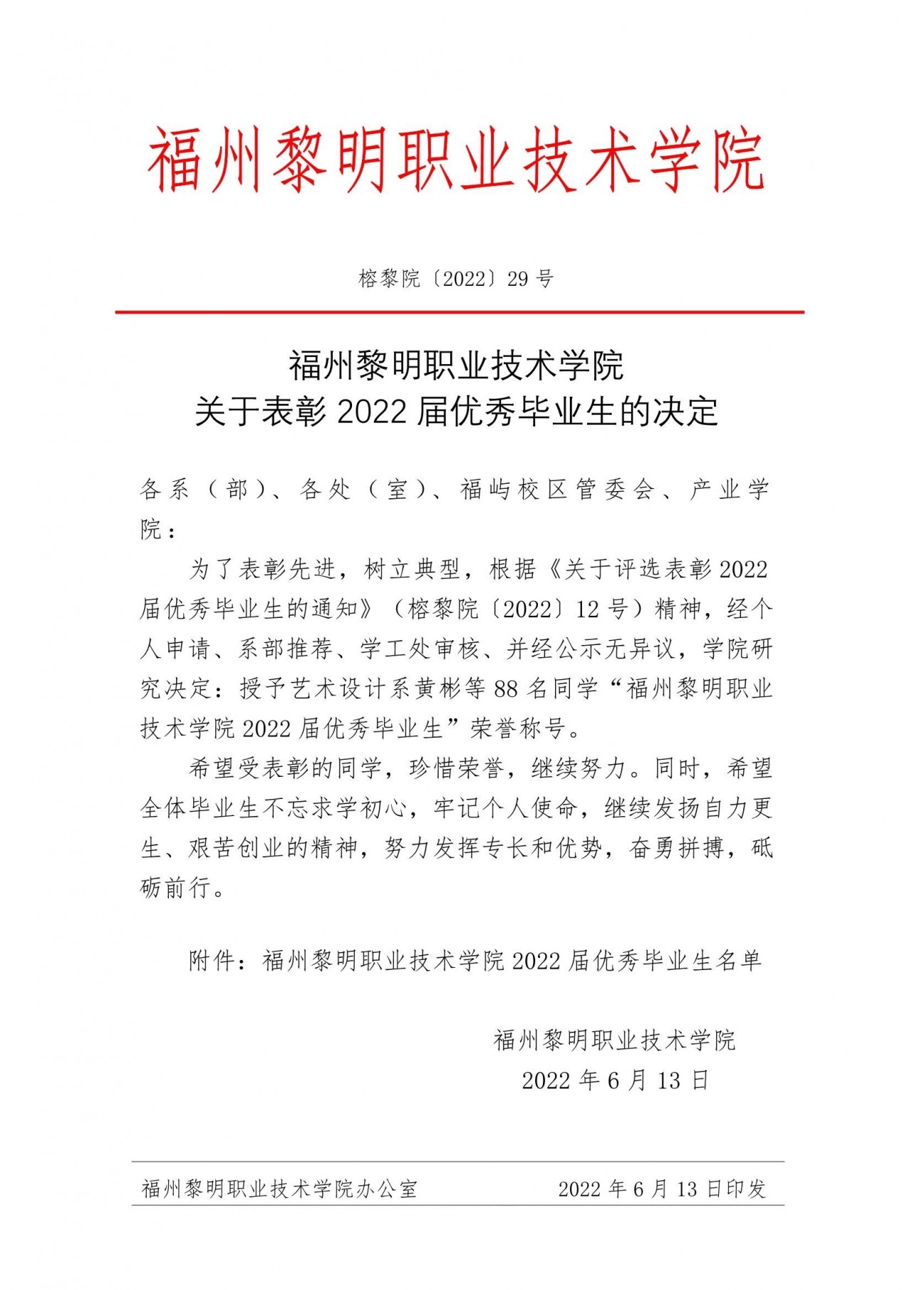 福州黎明职业技术学院关于表彰2022届优秀毕业生的决定