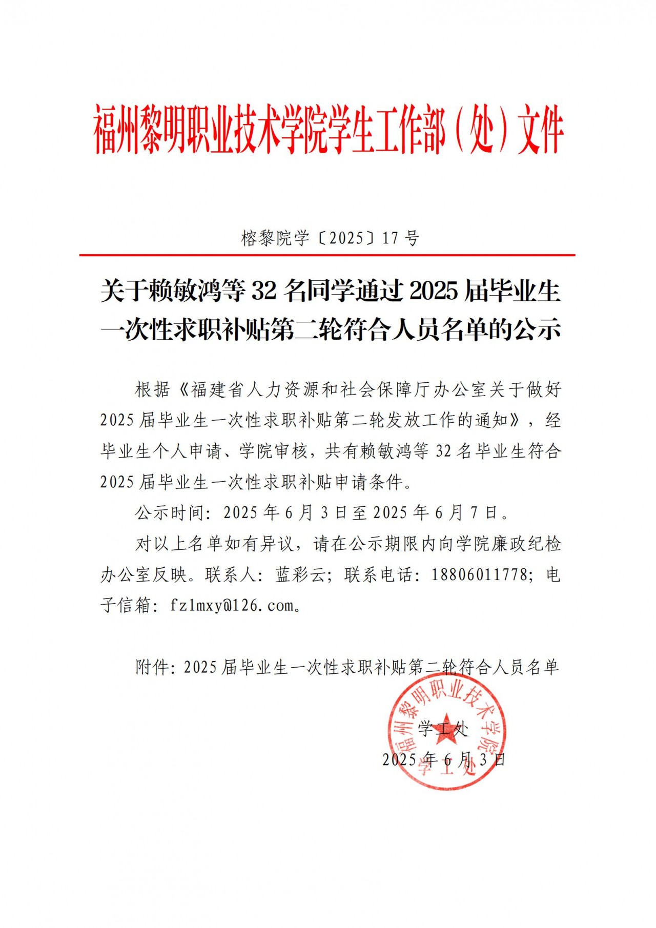 关于赖敏鸿等32名同学通过2025届毕业生一次性求职补贴第二轮符合人员名单的公示