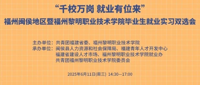 为深入学习贯彻党的二十大和二十届二中、三中全会精神,坚决落实党中央、国务院和省委省政府关于高校毕业生就业创业工作的决策部署,积极搭建用人单位与求职毕业生双向交流平台,更好的为学生及用人单位服务,全力促进毕业生高质量充分就业,共青团福建省委联合福州黎明职业技术学院开展“千校万岗 就业有位来”福州闽侯地区暨福州黎明职业技术学院毕业生就业实习双选会。本次招聘会为公益性招聘会,不向参会企业收取任何费用。现将有关事项函告如下: