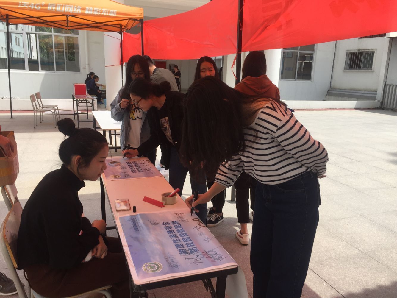 由于活动前期宣传充分,活动伊始,现场便是人头攒动。同学们表现出空前的热情,积极参与到签名活动中去,在横幅上留下自己的签名。活动现场,通过主题宣传、金融知识有奖问答互动等环节,吸引来来往往的同学。通过热情参与、积极答题,增加金融常识,同学们不自觉间便已加深对骗贷行为的警惕和甄别能力。更有同学表示,通过学校举办的一系列与校园贷相关的活动,他们更加清晰地认识到校园贷潜在的危害,在生活中得以加强防范。
