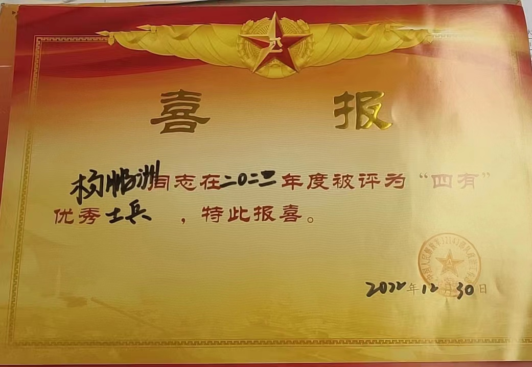 近日,中国人民解放军某部队政治工作部给学校寄来喜报,祝贺2021年在校参军入伍、现役战士杨鹏洲同学,服役期间被评为“四有”优秀士兵。