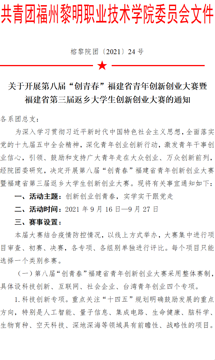 榕黎院团〔2021〕24号———— 关于开展第八届“创青春”福建省青年创新创业大赛暨福建省第三届返乡大学生创新创业大赛的通知