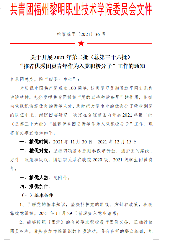 榕黎院团〔2021〕36号——关于开展2021年第二批(总第三十六批)“推荐优秀团员青年作为入党积极分子”工作的通知