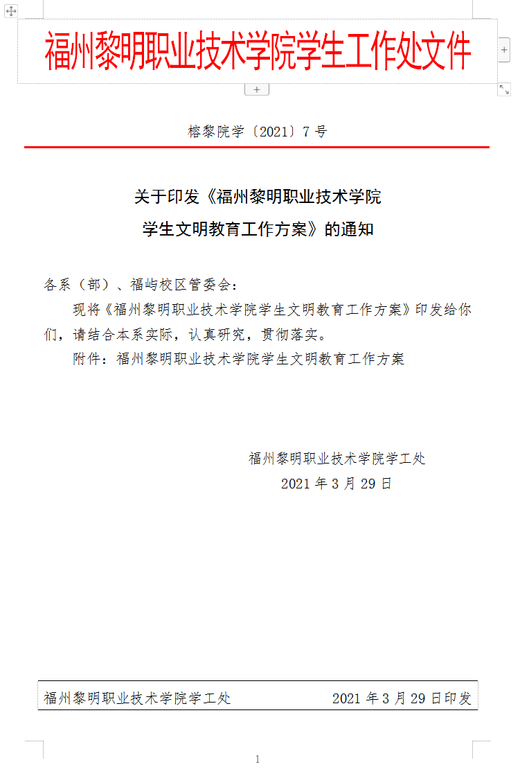 榕黎院学〔2021〕7号——关于印发《福州黎明职业技术学院学生文明教育工作方案》的通知