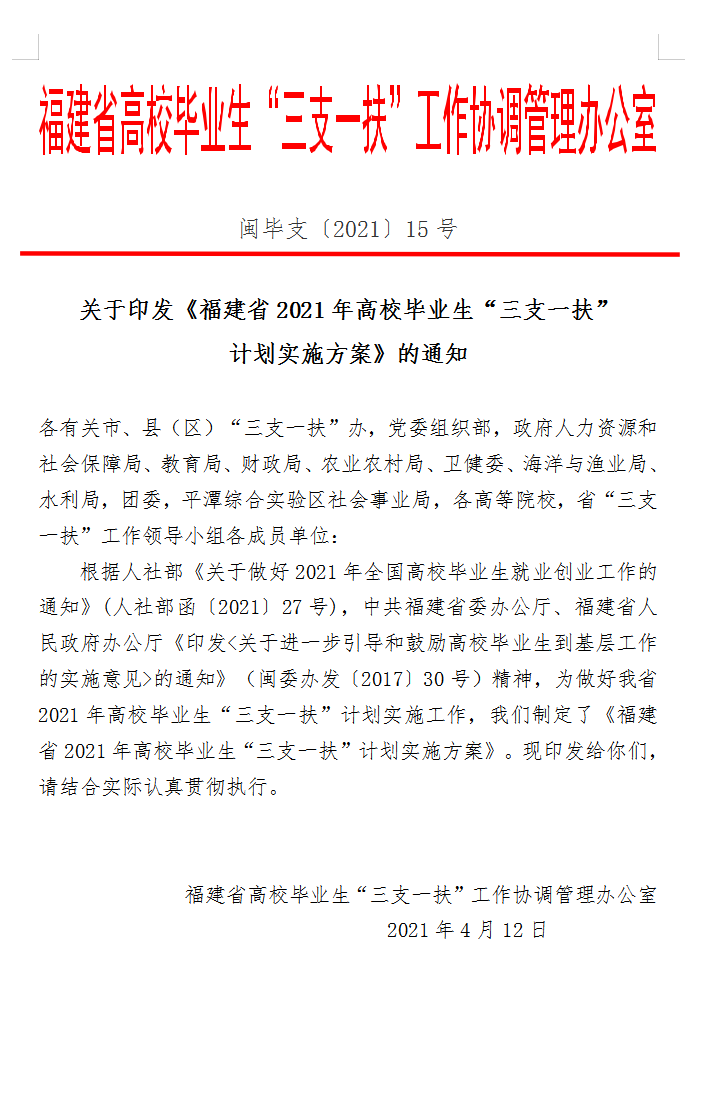 榕黎院学〔2021〕13号——转发福建省高校毕业生“三支一扶”工作协调管理办公室《关于印发〈福建省2021年高校毕业生 “三支一扶”计划实施方案〉的通知》的通知