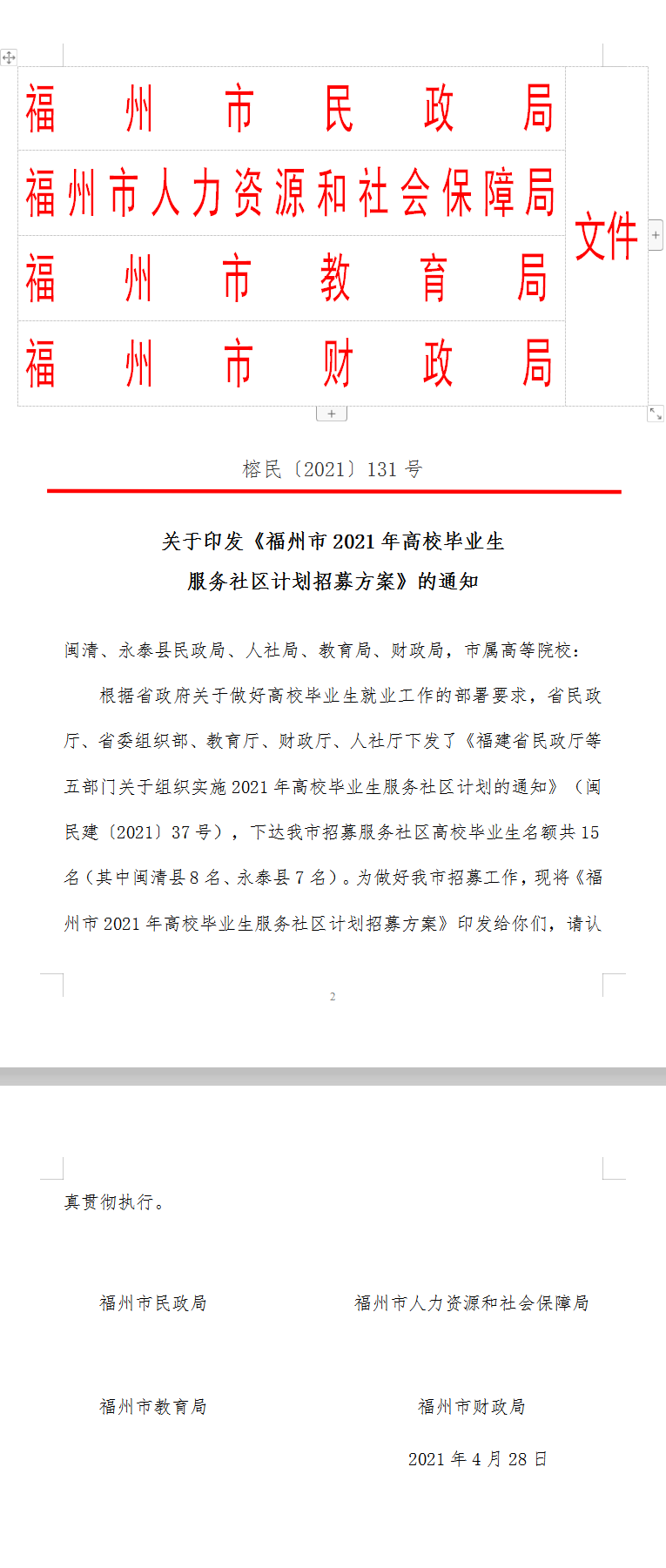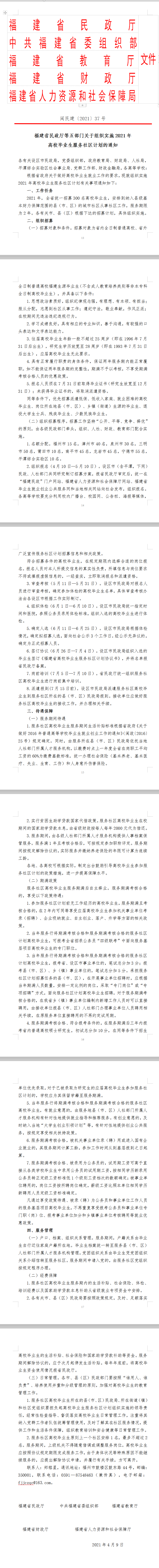 榕黎院学〔2021〕14号——关于转发福州市民政局等四部门《关于印发〈福州市2021年高校毕业生服务社区计划招募方案〉的通知》的通知