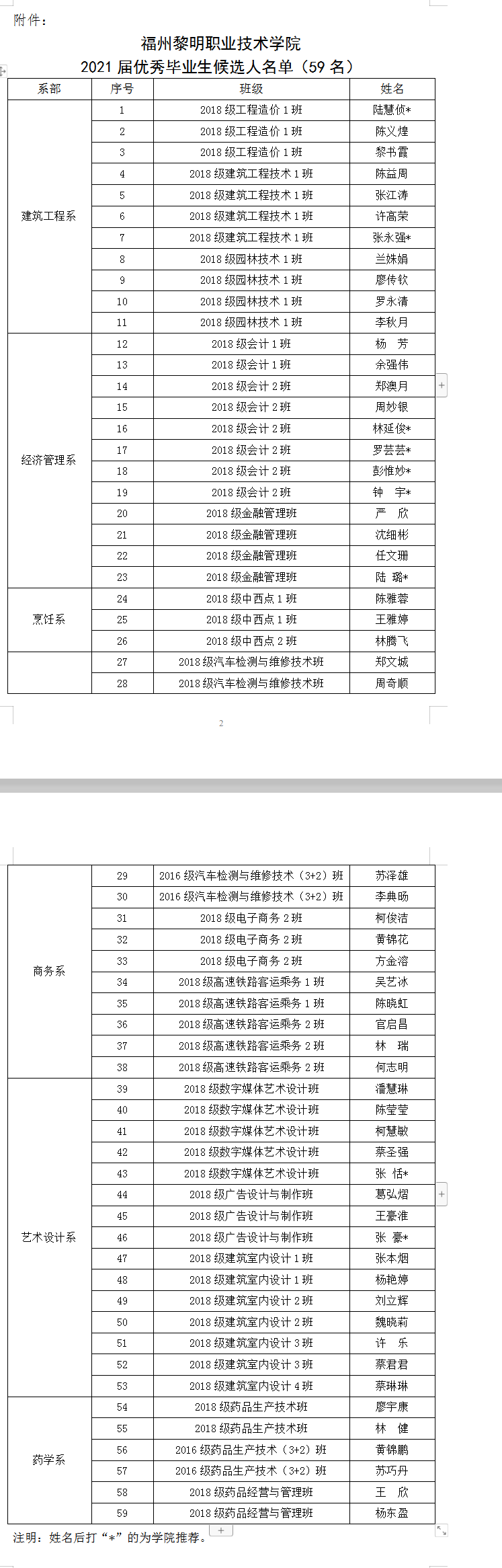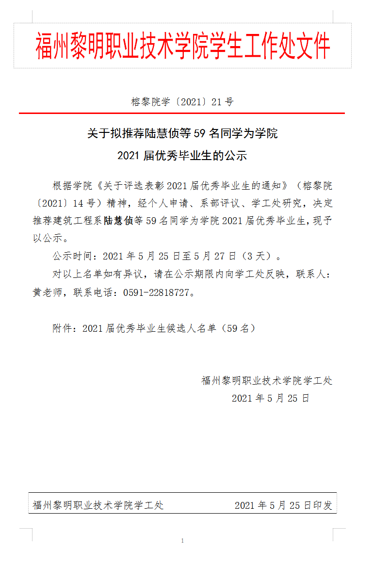 榕黎院学〔2021〕21号——关于拟推荐陆慧侦等59名同学为学院2021届优秀毕业生的公示