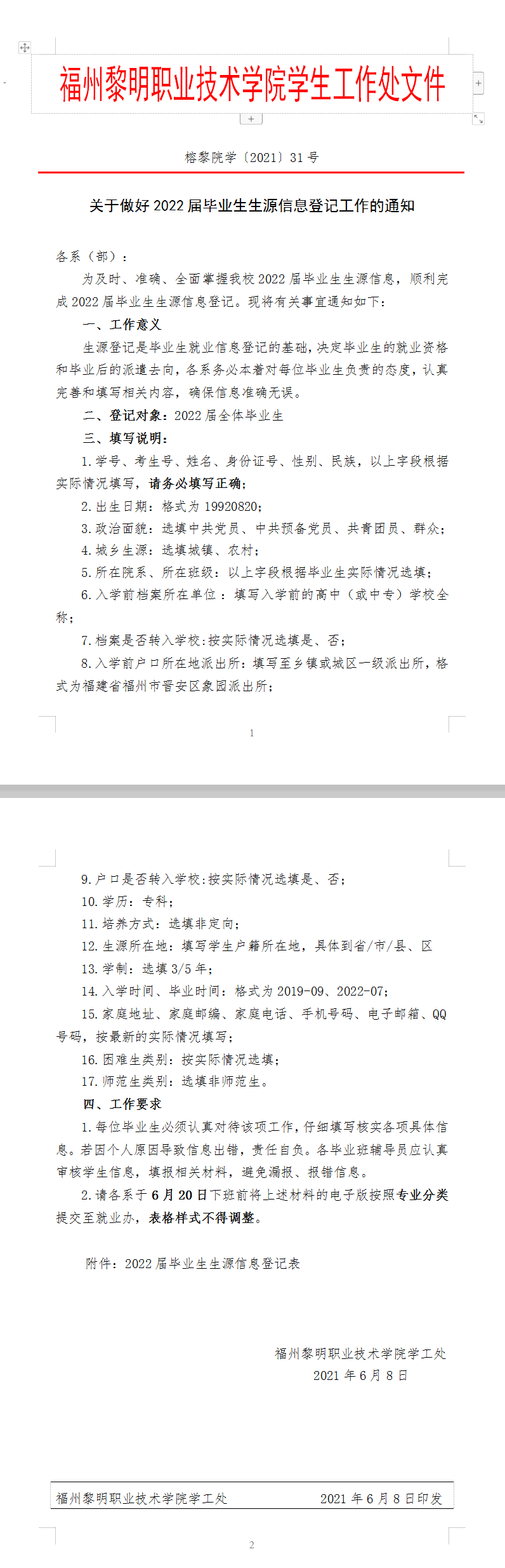 榕黎院学〔2021〕31号——关于做好2022届毕业生生源信息登记工作的通知