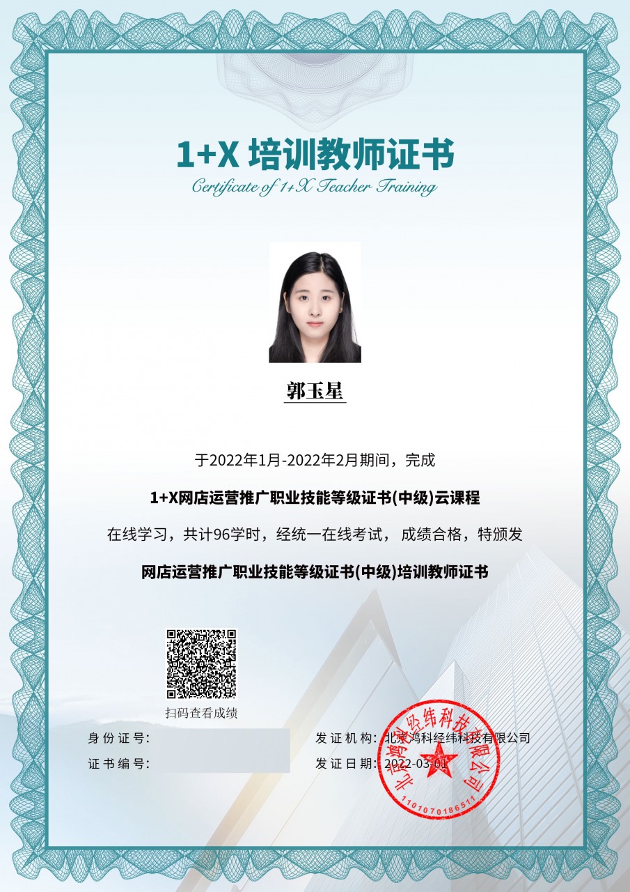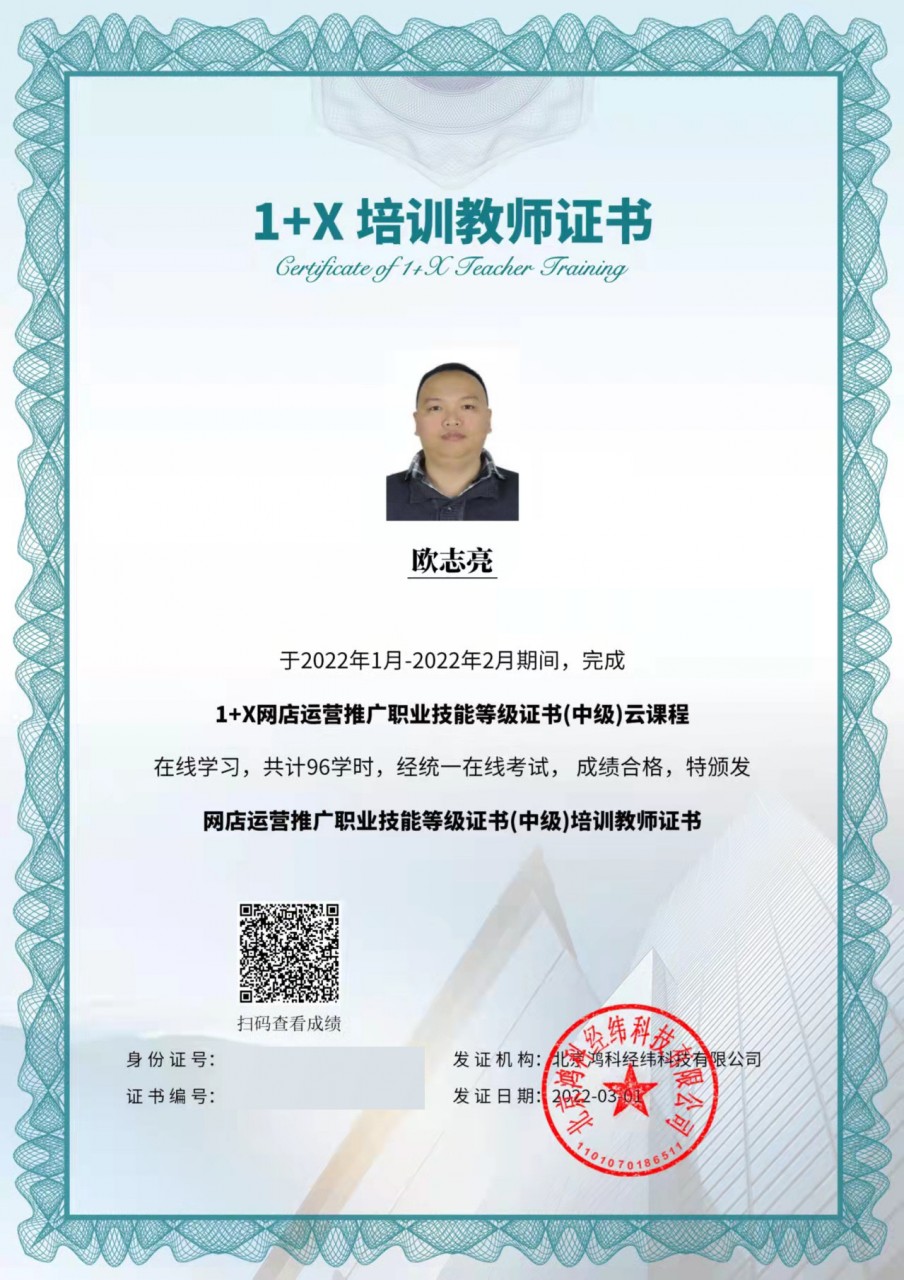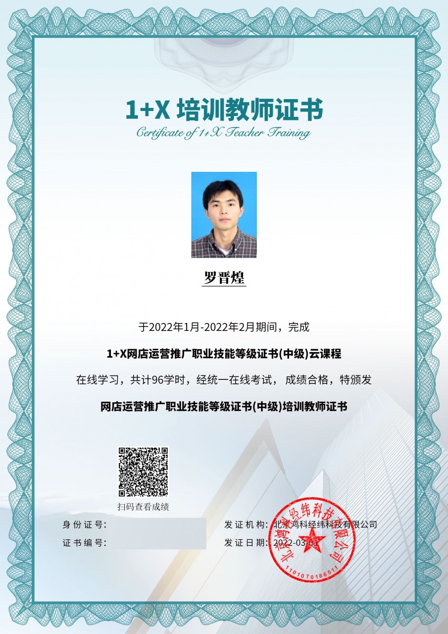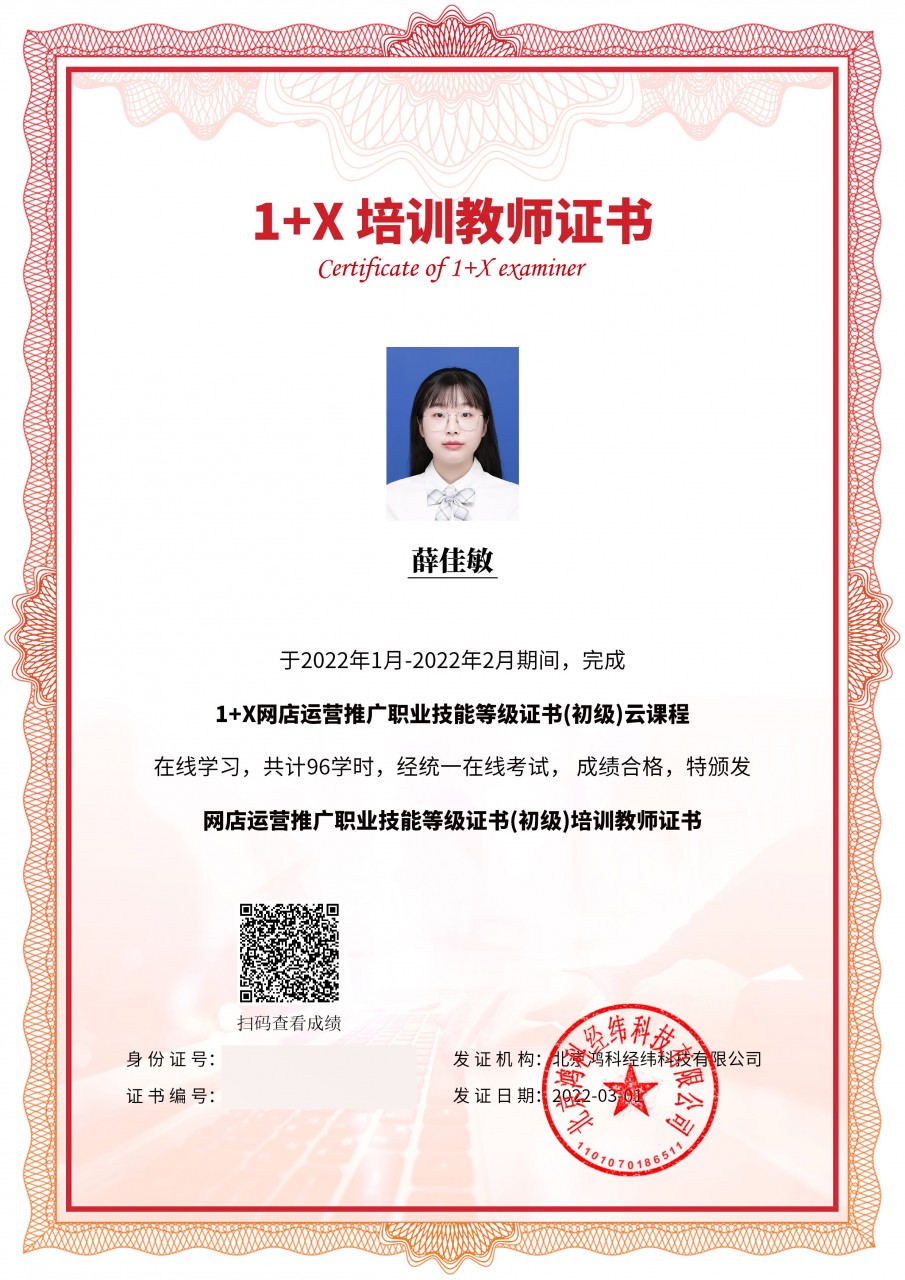 我校商务系在省第四批职业教育1+X证书制度试点的申报中,获得1+X网店运营推广职业技能等级证书试点单位。为稳步推进提升教师的教学、培训和考核评价能力,该项目的评价组织北京鸿科经纬科技有限公司,于2022年1月-2月,开展了网店运营推广职业技能等级证书线上师资培训工作。我系电子商务专业的欧志亮、罗晋煌、谢佳敏、郭玉星等4位教师参加了学习和培训,他们顺利通过考核,均获得网店运营推广职业技能等级证书(中级、初级)培训教师证书,为我系1+X证书制度试点建设和培训工作提供了有利的条件和可靠的保证。