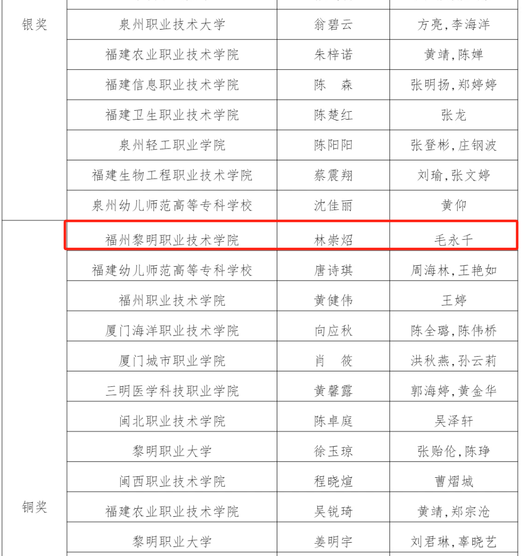 近日,福建省教育厅印发《关于公布第十六届福建省大学生职业规划大赛获奖名单的通知》,我院郑金忠同学获成长赛道职教组铜奖(指导老师:郑爱清、林梦超)、林崇炤获就业赛道职教组铜奖(指导老师:毛永千)。