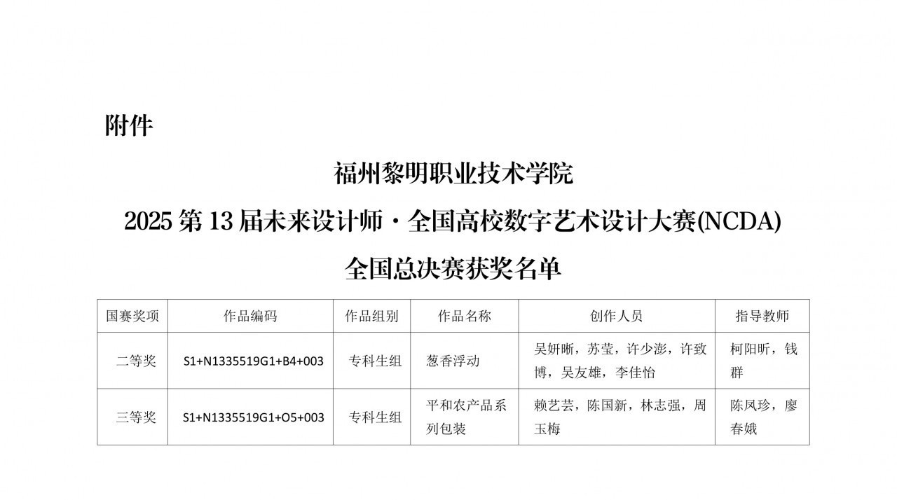 近日,2025年第13届未来设计师·全国高校数字艺术设计大赛国赛(NCDA)成绩揭晓。我院学生在激烈的竞争中脱颖而出,其中2023级数字媒体艺术设计3班的吴妍晰、苏莹、许少澎、许致博、吴友雄、李佳怡等6位同学的作品《葱香浮动》荣获二等奖(指导老师:柯阳昕、钱群),2023级广告艺术设计3班赖艺芸、陈国新、林志强、周玉梅等4位同学的作品《平和农产品系列包装》获得三等奖(指导老师:陈凤珍、廖春娥)。