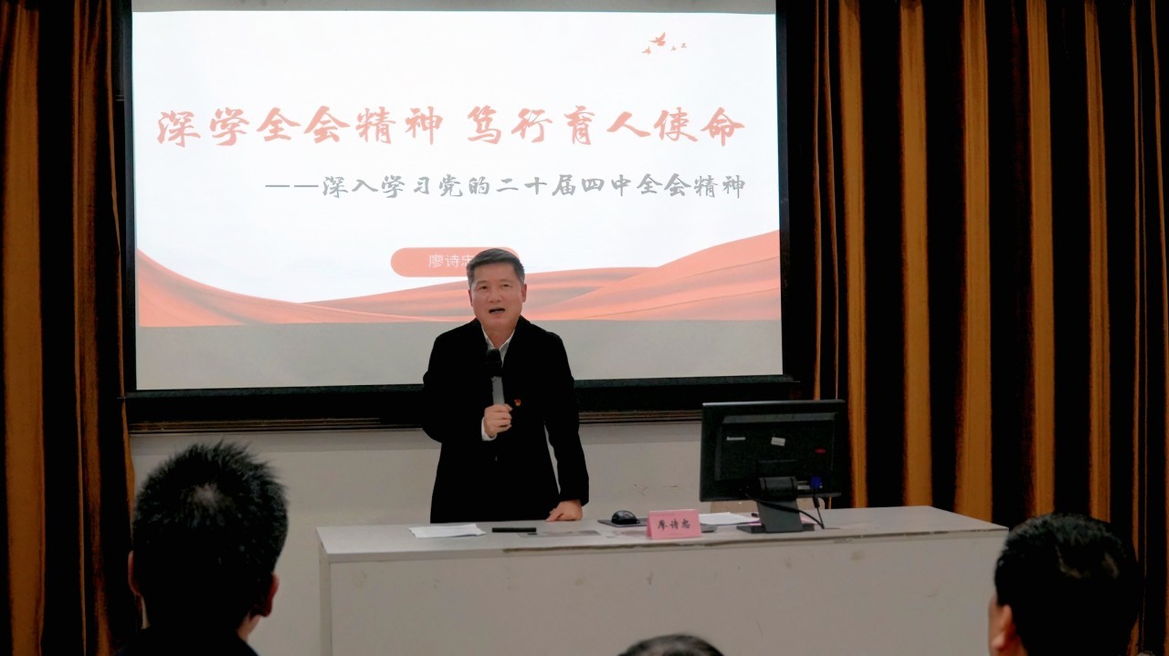 廖诗忠围绕习近平总书记在党的二十届四中全会上的重要讲话精神和全会审议通过的《建议》,系统阐述了全会的重大意义、时代背景、总体要求与重点任务。他结合习近平总书记的重要讲话和重要指示精神,对全会精神作了深入解读,强调要坚持用党的创新理论指导育人实践,将学习贯彻全会精神与深化学院“爱的教育”办学理念有机融合,教育引导广大学生在奉献国家、服务社会的实际行动中坚定理想信念、锤炼过硬本领、实现人生价值。
