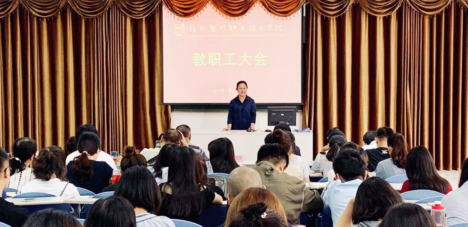 2019年9月8日上午,学院新学期教职工大会在地球村校区阶梯二教室举行,学院党委陈建国书记传达了省、市教育会议精神,学院范超峰院长部署了新学期工作,王苏华董事长到会并讲话,院领导杨光舟、魏洪、肖熙、刘思衡及处系负责人、全院教职员工参加了会议。会议由范超峰院长主持。