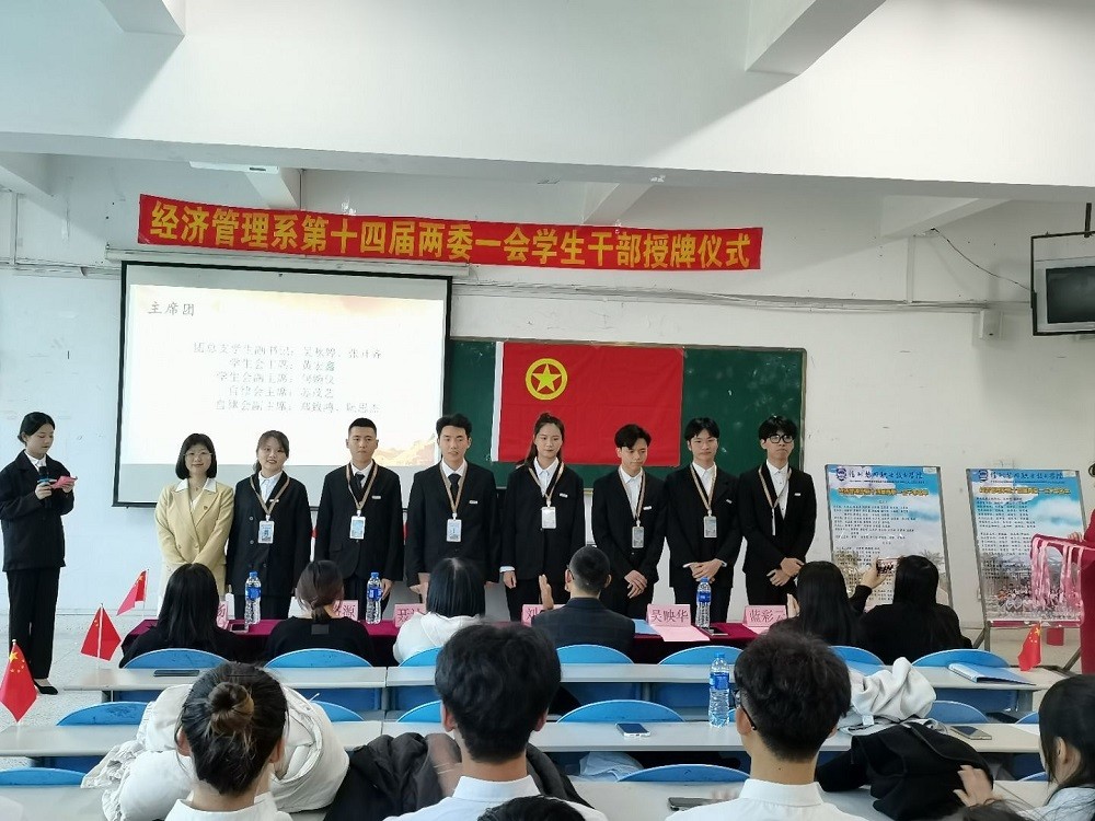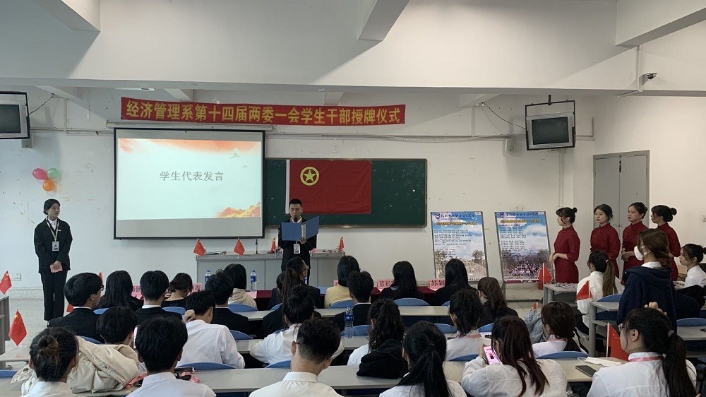 接下来由团总支学生副书记张开齐代表学生干部进行发言,表明职责与决心。活动最后由学工处聂计闽老师对本次经济管理系学生干部授牌仪式提出了认可与期许!为本次干部授牌仪式拉上帷幕。