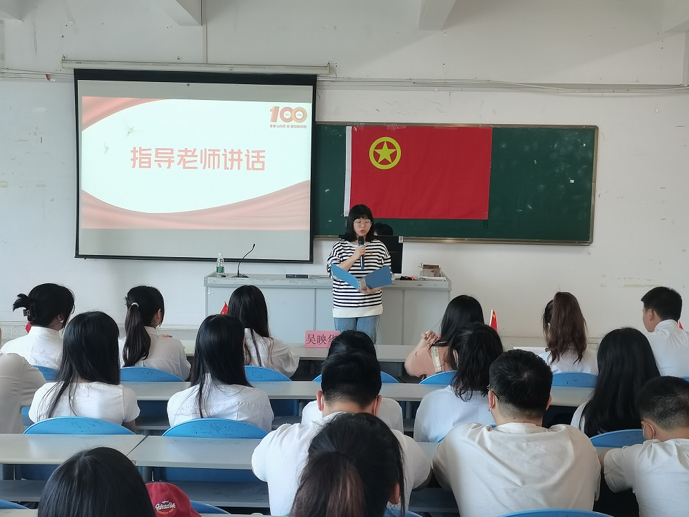 团总支书记吴映华老师在活动上,向我们讲述了百年前的今天,在中国共产党的关怀和直接领导下,迎来了中国共青团的成立,以及党领导团前进,团紧跟党奋斗的百年团史;对全体团员提出希望,新时代青年要不断加强党史、团史学习,坚定理想信念,树立远大理想,在细照笃行中不断修炼、提升自我,积极发挥模范带头作用,锻炼“筋骨”,磨砺“精神”。2022年作为中国共青团成立100周年和党二十大召开之年,身为新时代青年的我们,应不忘初心跟党走,砥砺奋进结硕果。