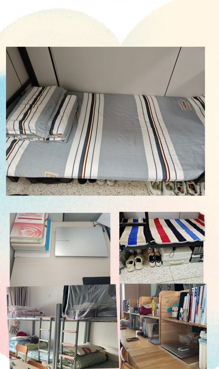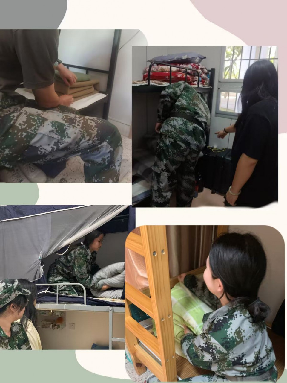 蹲下,铺平、压实、翻折、抠角、捏线……一个小小的“豆腐块”初见雏形。同学们按照教官传授的步骤,认真尝试,反复实践。拉扯被角,折叠边缘,清扫地面……经过不懈努力,原本杂乱无章的宿舍变得整洁有序。方方正正的豆腐块不仅代表着细心,更体现严谨认真的态度。