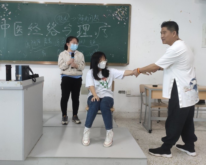 在讲座过程中张医生用生活中的小问题为例子进行讲解并邀请同学们发表自己的看法,同学们踊跃发言。张医生还邀请现场脖颈肩周有不适症状的同学们上台体验,以实践操作更直接明了的为同学们展示中医经络理疗的功效。实践过程中同学们十分好奇,纷纷上前观摩,感叹中医经络理疗的奥妙。