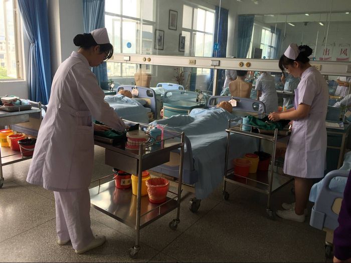 福建卫职院护理系的谢涛书记和龚海榕主任给予我们热情接待。在会议室中,大家进行了座谈。首先,药学系曾建雄老师就药学系基本概况、此次开展调研目的等向谢书记和龚主任做了简要介绍。黄建虹老师就护理专业的招生情况、人才培养、就业去向、专业申报条件等内容向护理系两位领导进行请教,谢书记和龚主任都给予热情解答。而后,在谢涛书记的带领下,大家分别参观了基础护理实训室、内外儿妇等各科护理实训室。整个调研活动环节丰富,大家收获颇丰,感触深刻。
