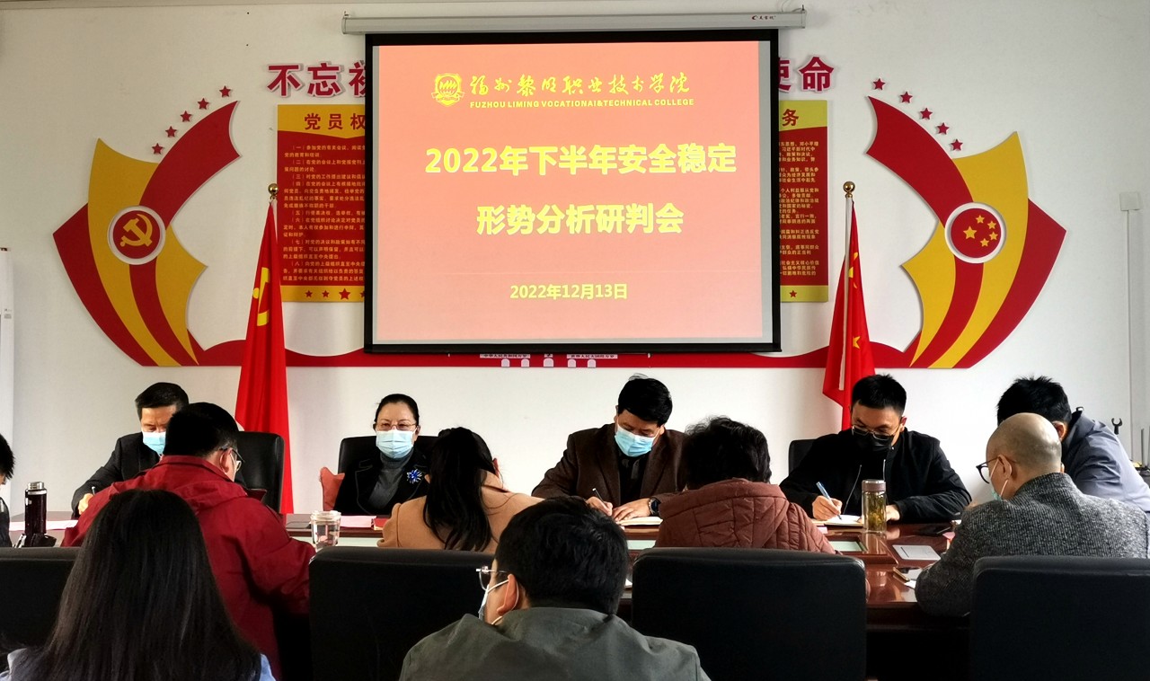 12月13日上午,学院在地球村校区五楼会议室召开2022年下半年安全稳定形势分析研判会,学院董事长王苏华,院长范超峰,党委书记廖诗忠,副院长杨光舟,董事长助理刘鹏、陈玉池,学院董事肖熙,各总支(支部)书记、各系(部门)主要负责人参加会议。会议由党委副书记王新华主持。
