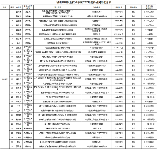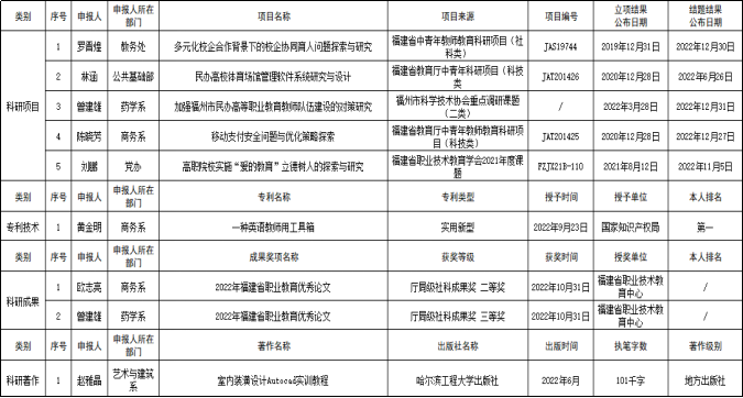 根据《关于做好2022年度科研奖励申报工作的通知》(榕黎院科〔2023〕1号)要求,依据《福州黎明职业技术学院科研奖励办法》,经个人申报、二级科研机构初审、科研处复审、校学术委员会终审,现将学院2022年度科研奖励获奖名单及相关信息公示如下: