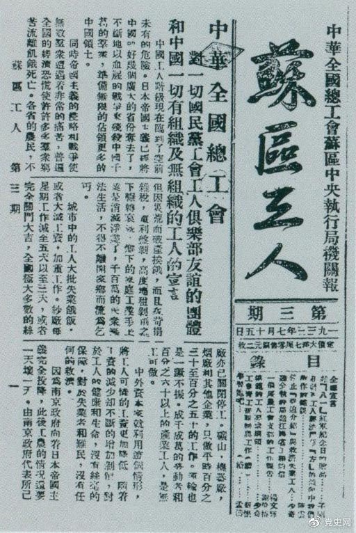 1933年7月15日,刘少奇在《苏区工人》报第三期上发表《停止“强迫介绍”与救济失业工人》和《模范的工人要求纲领》两篇文章。