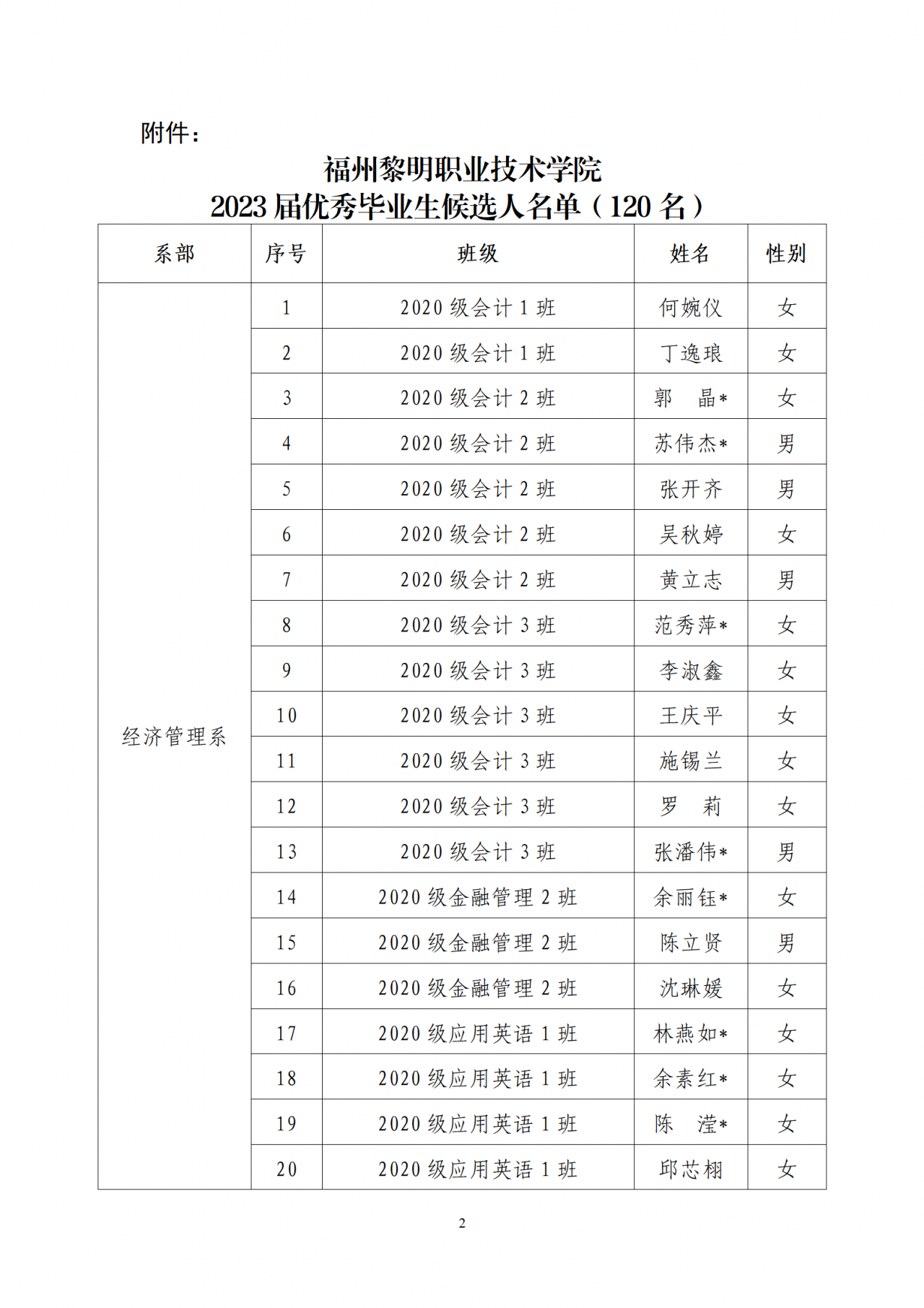根据学院《关于评选表彰2023届优秀毕业生的通知》(榕黎院〔2023〕16号)要求,经个人申请、系部评议、学工处研究,决定推荐经济管理系何婉仪等120名同学为学院2023届优秀毕业生,现予以公示。