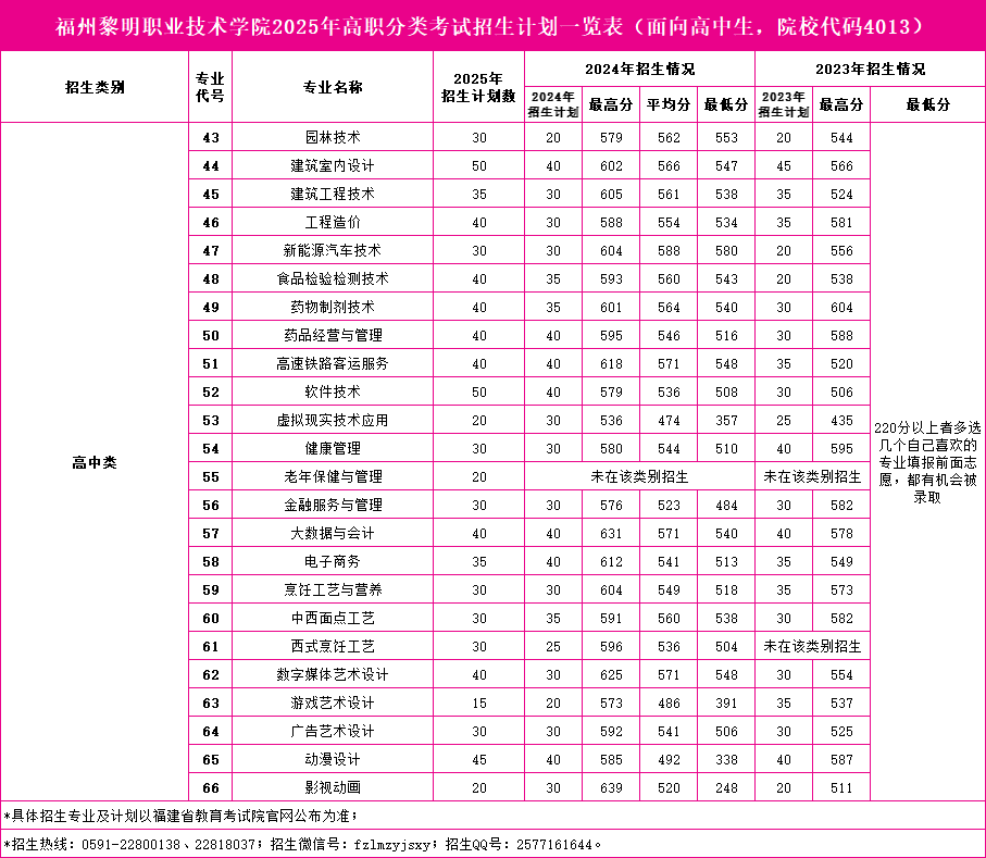 福州黎明职业技术学院2025年高职分类考试招生计划一览表(院校代码4013)