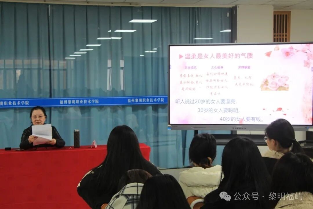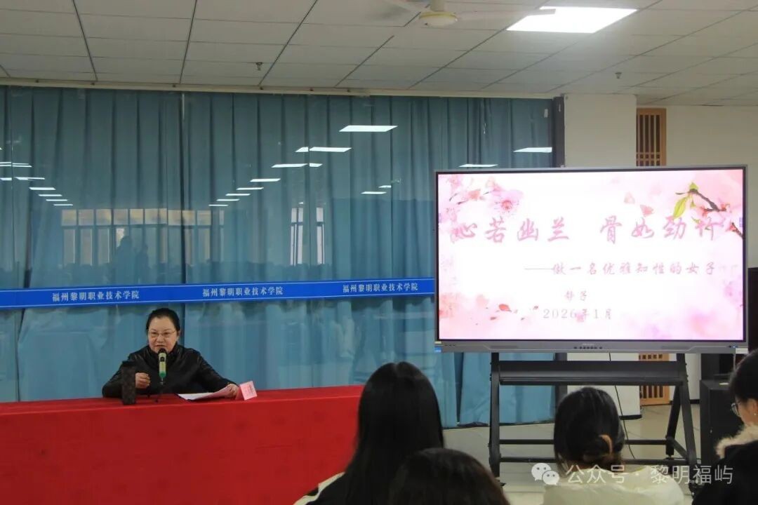 2026年1月7日下午,学院董事长王苏华女士亲临福屿校区,为2025级全体女生开展了一场以“女性气质提升”为核心的主题讲座。王董事长以深厚的文化修养和丰富的人生体悟,深入阐释了中国传统美学中女性气质的内涵与当代实践路径,引领在场同学开启一场“向内探索、向上生长”的自我启迪之旅。讲座由福屿校区第二党支部书记陈久主持,2025级全体女生共计260余人现场聆听。
