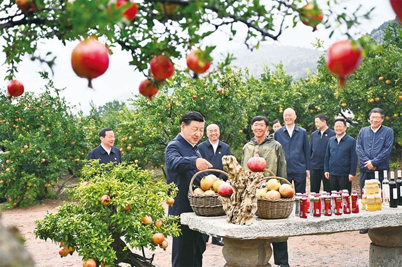 2023年9月24日,中共中央总书记、国家主席、中央军委主席习近平在浙江考察结束返京途中,来到山东省枣庄市考察。这是习近平在位于峄城区的冠世榴园石榴种植园了解石榴产业发展情况。